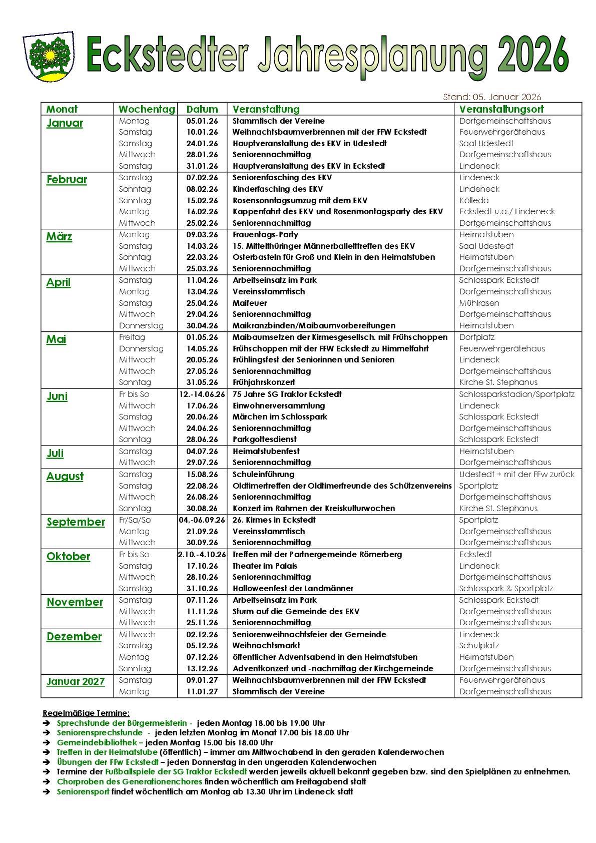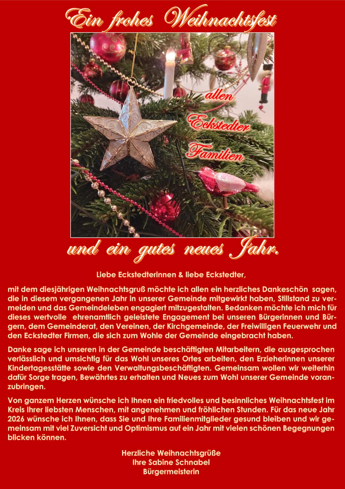 Gemeinde Eckstedt mit ihren Angeboten und Möglichkeiten vor. So finden Sie hier neben einer Schnellinformation, aktuellen Infos sowie geplanten und bereits fertiggestellten Projekten auch einen Terminplan in dem alle öffentlichen Veranstaltungen der Gemeinde und unserer Vereine für das ganze Jahr aufgeführt sind. Einige Informationen können Sie auch unserem Gemeindeflyer entnehmen. Gemeinde Eckstedt Sabine Schnabel Bürgermeisterin |